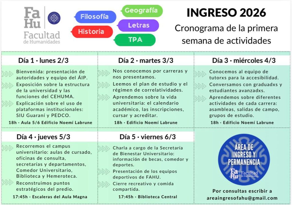 Te esperamos desde el lunes 2 de marzo en la Facultad de Humanidades para comenzar con las actividades previstas para ingresantes. No importa si ya cursaste otra carrera o vas a empezar una por primera vez, tampoco tu edad: esta semana está pensada para que nos conozcamos y empecemos a entender varios aspectos de la vida universitaria que serán importantes a lo largo de tu cursada.