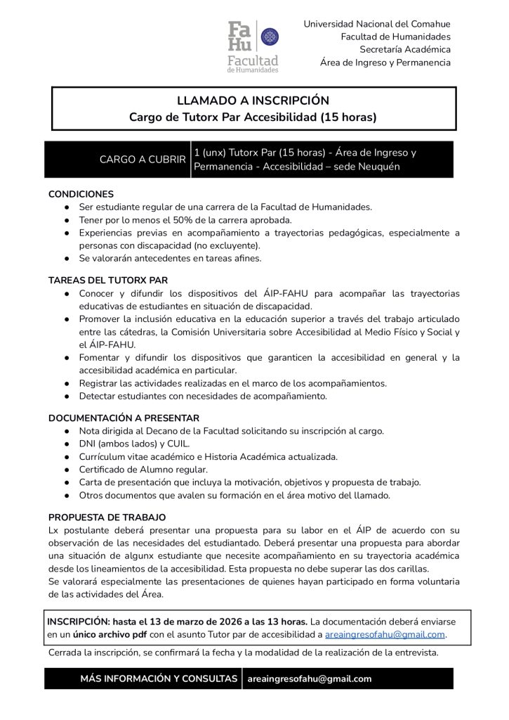 La Secretaría Académica – Área de Ingreso y Permanencia de la Facultad de Humanidades – Universidad Nacional del Comahue convoca a inscripción para cubrir el siguiente cargo: