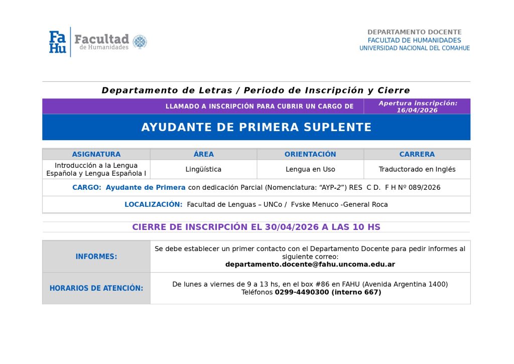 Llamado a inscripción para un cargo AYP2 – Suplente – Introducción a la Lengua Española y Lengua Española I