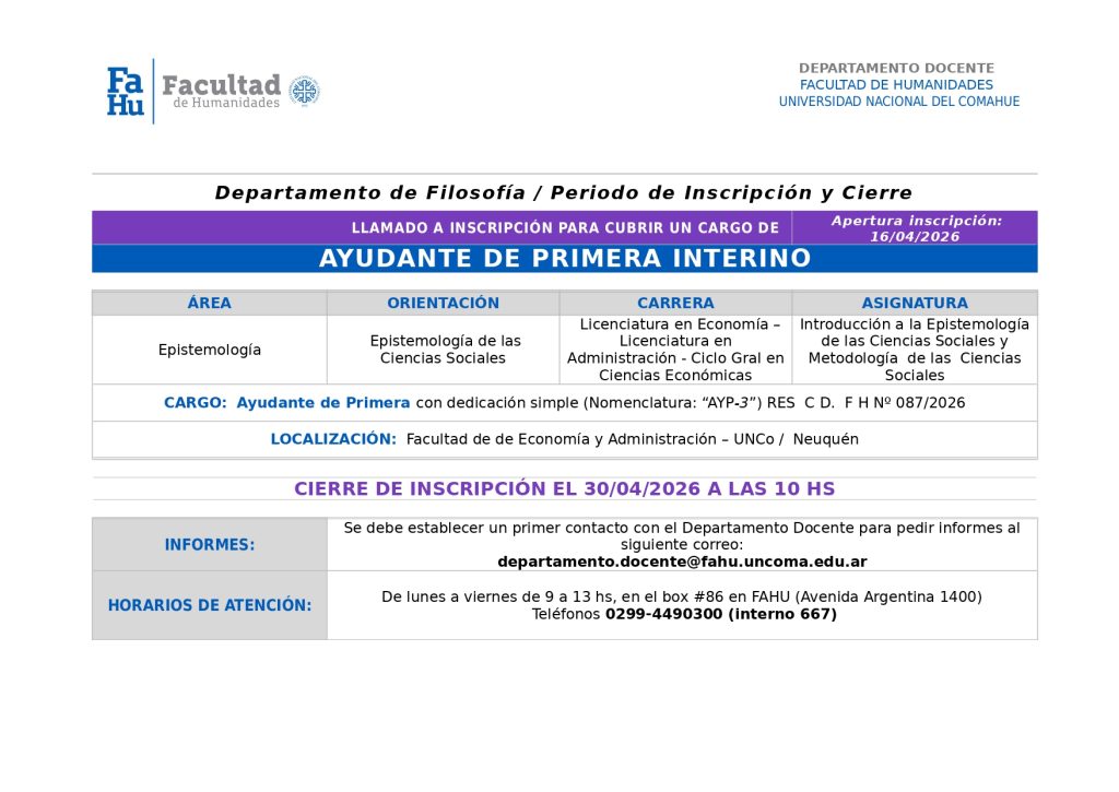 Llamado a inscripción para un cargo AYP3 – Interino – Introducción a la Epistemología de las Ciencias Sociales y Metodología de las Ciencias Sociales