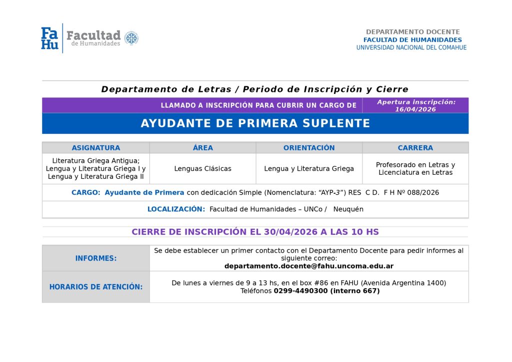 Llamado a inscripción para un cargo AYP3 – Suplente – Literatura Griega/Lengua y Lit. Griega I y II